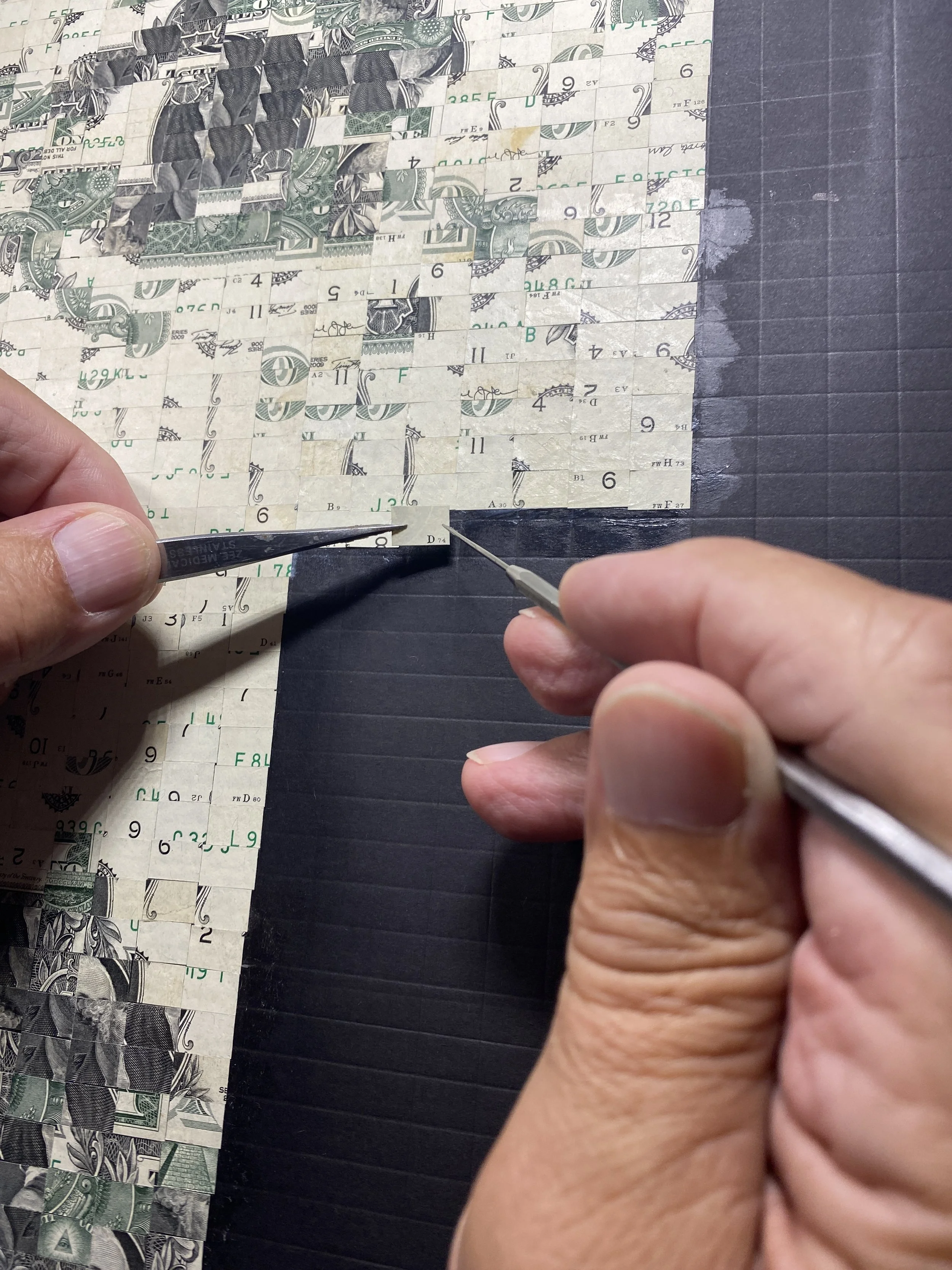 It is generally legal to use money for art, provided the artist does not have fraudulent intent to alter its denomination or create counterfeits.  While Section 333 of Title 18 of the U.S. Code prohibits mutilating currency to make it unfit for reissue, this is typically only prosecuted if the intent is to defraud or destroy the currency.